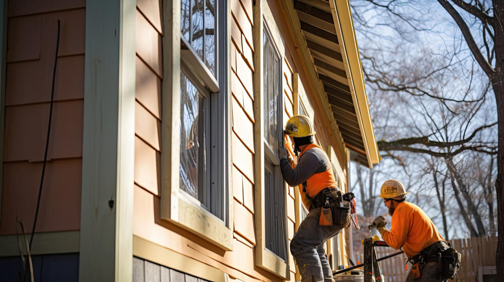 Builders Skillfully Installing Exterior Siding And Meticulously Placing Trim On A House